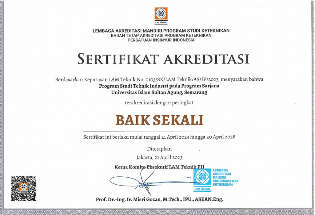 Program Studi Teknik Industri UNISSULA telah mengalami proses akreditasi sebanyak 4 kali, yaitu pada tahun 2008, 2013, 2018, dan yang paling terbaru dalam 2023. Berikut sertifikat untuk setiap periode akreditasi Program Studi Teknik Industri UNISSULA :